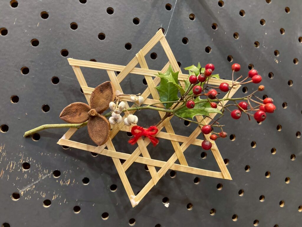 今回は基本を応用し、この季節にぴったりの「星形」と「雪の結晶」を制作。 同じ手法でも、ひごの出し方やカットの仕方で表情がガラリと変わるのが竹細工の奥深いところです。
